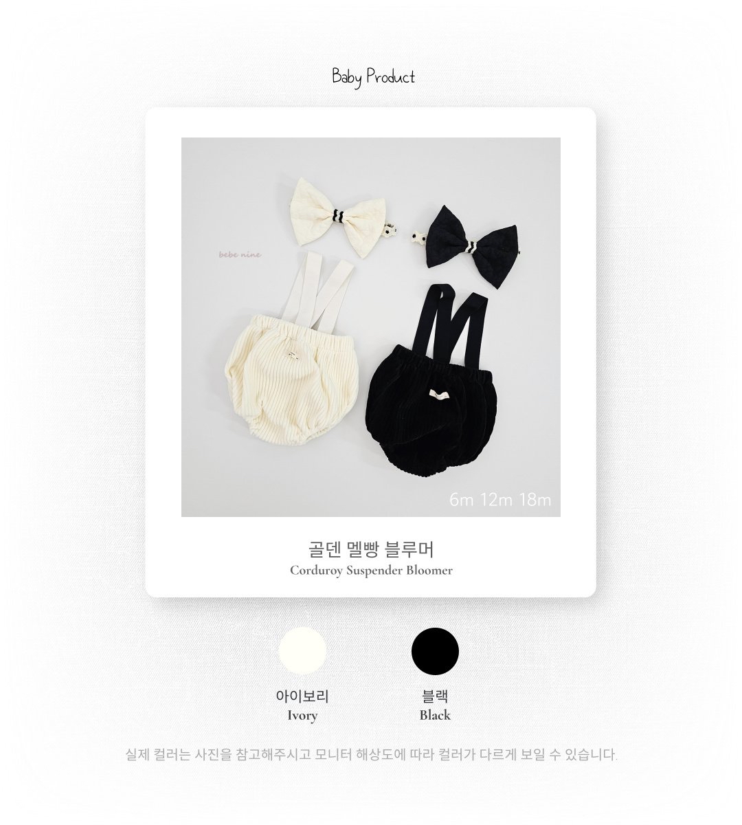 ❄️預訂 韓國直送❄️🇰🇷Bebenine兩色燈芯絨背帶褲 *不包括其他服飾及配件 🚚預計貨期:約14-21個工作日 (貨期有機會提早或延遲) 🎨顏色:象牙|黑色 📐尺碼:6m(70)|12m(80)|18m(90) 40% 棉、29% 莫代爾、28% 聚酯纖維、3% 氨綸 MADE IN KOREA🇰🇷 📦熱門貨品將跟據客人付款先後次序分配💞 🔺如產品出現斷貨將會全數退回🔺 ⚠️除非有列明 否則不包含其他服飾及配飾