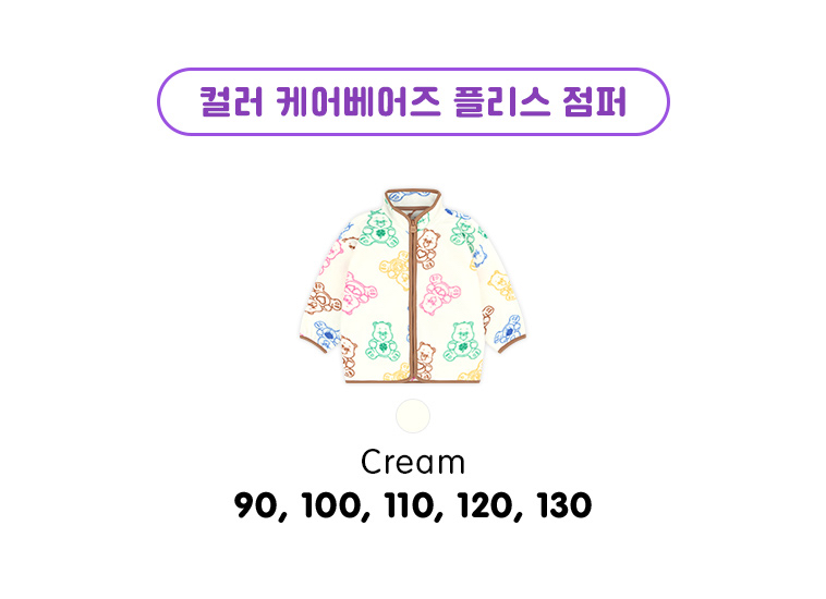 ❄️預訂 韓國直送❄️🇰🇷CareBears彩色小熊滿印抓絨拉鍊外套 🚚預計貨期:約14-21個工作日 (貨期有機會提早或延遲) 採用雙面抓絨布料製成,輕盈透氣,換季時節可單獨穿著,冬季可作為內層穿著。 🎨顏色:奶油 📐尺碼:90|100|110|120|130 100% 聚酯纖維 韓國布料 中國代工 韓國KC認證 📦熱門貨品將跟據客人付款先後次序分配💞 🔺如產品出現斷貨將會全數退回🔺 ⚠️除非有列明 否則不包含其他服飾及配飾 商品說明 ※ 因拍攝燈光效果可能造成色差,請以實品顏色為準。