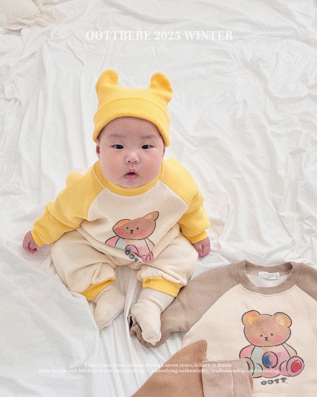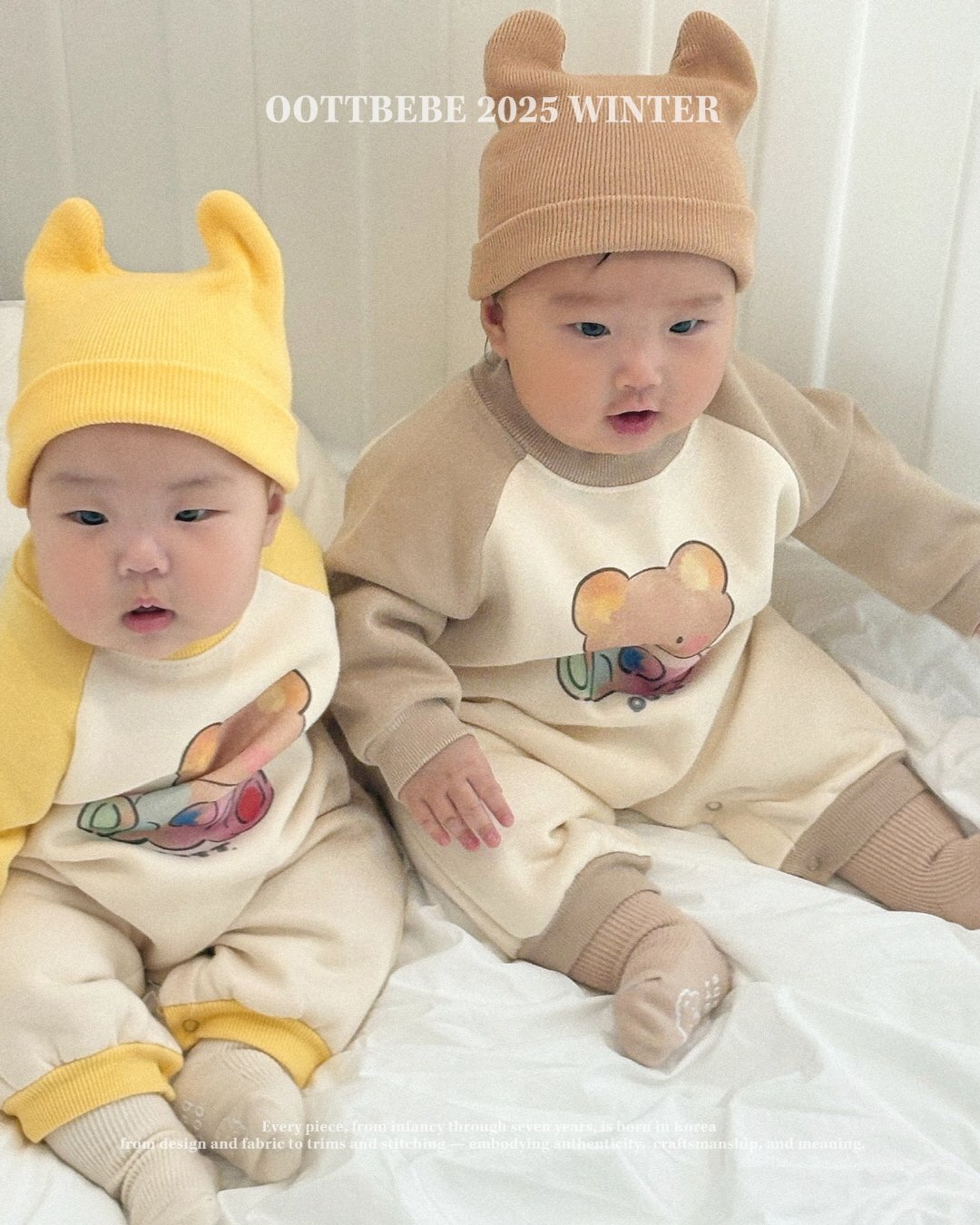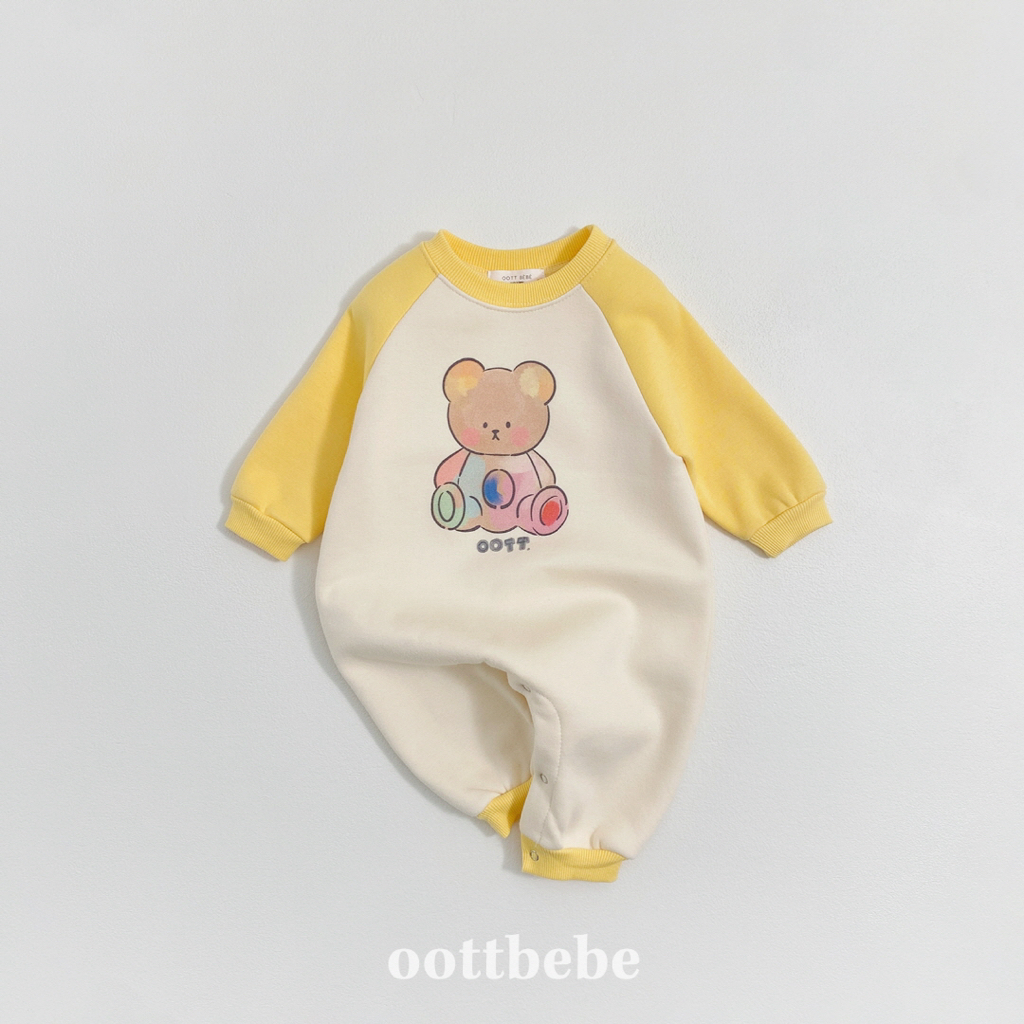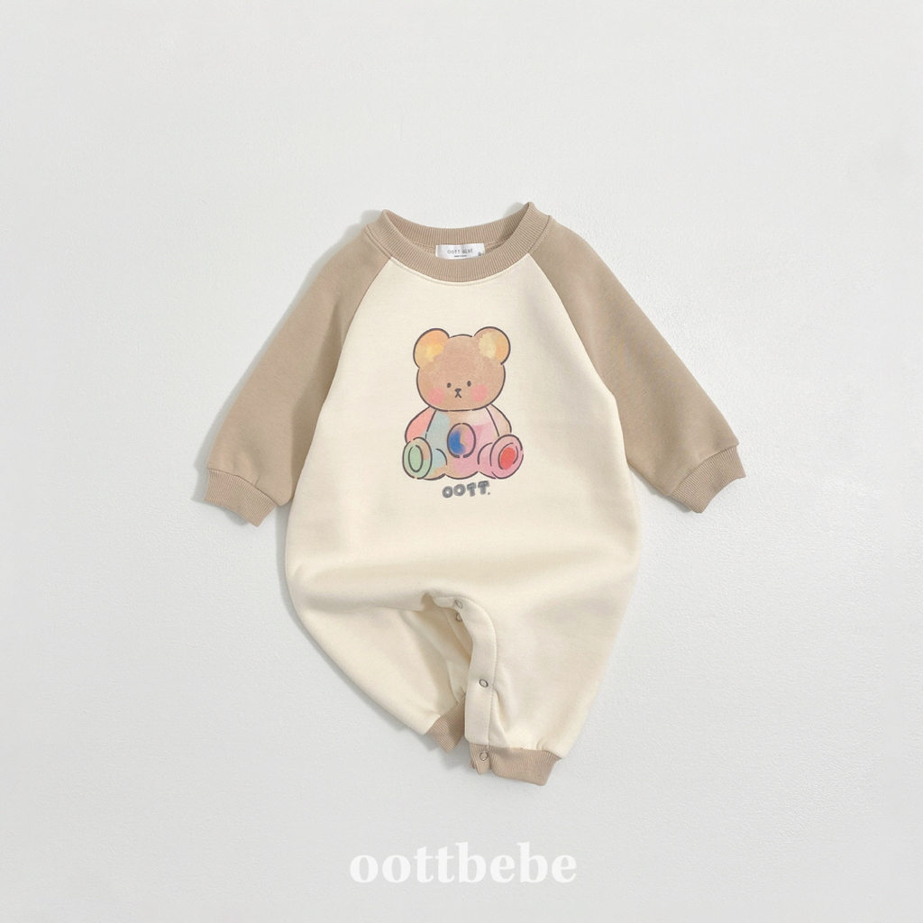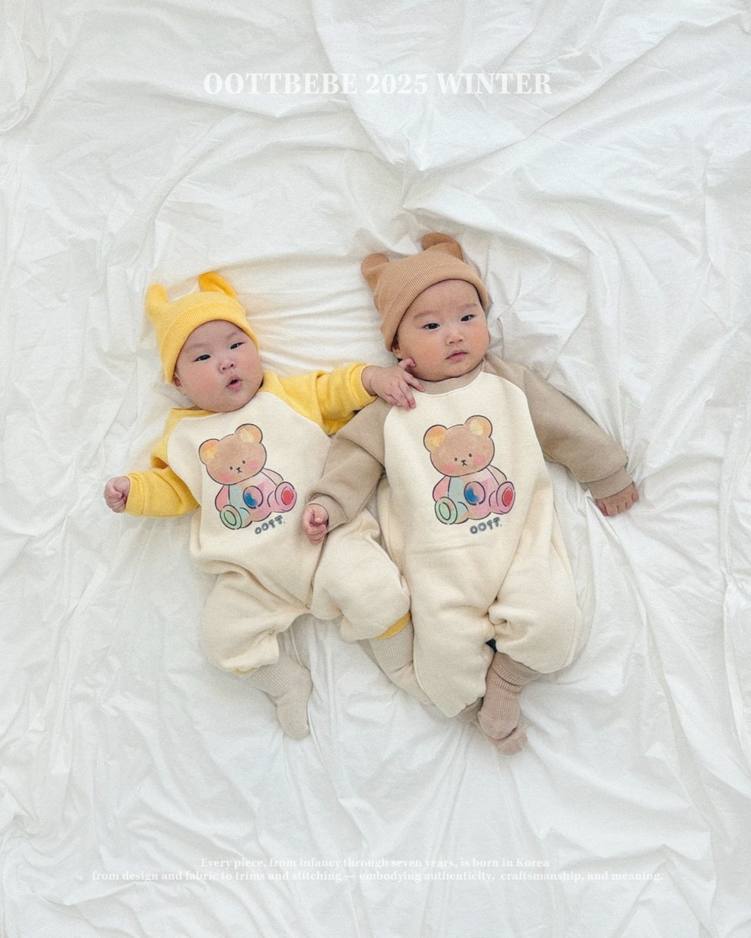 ❄️預訂 韓國直送❄️🇰🇷OOTTBEBE兩色彩繪小熊印花拼色拉絨長袖連身服