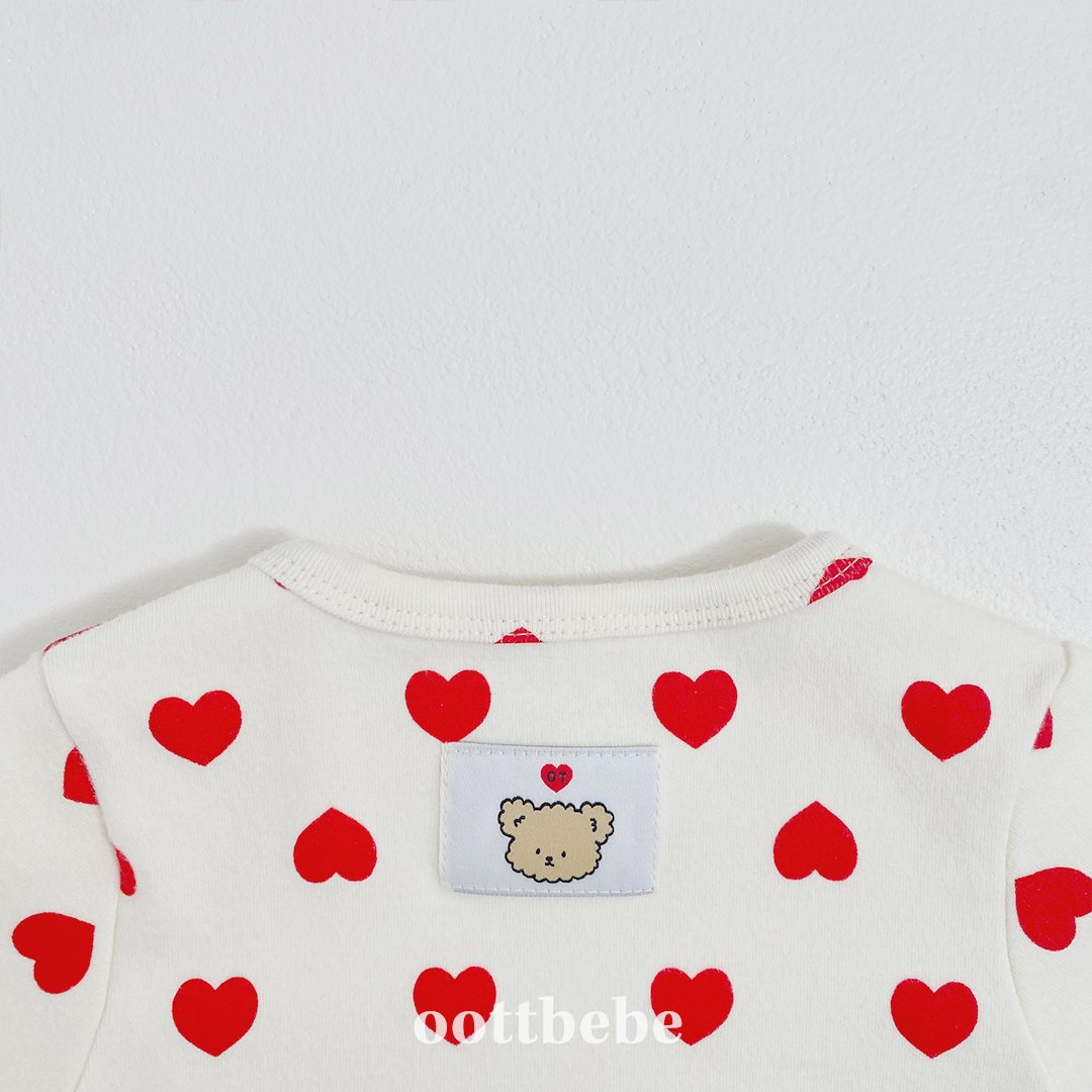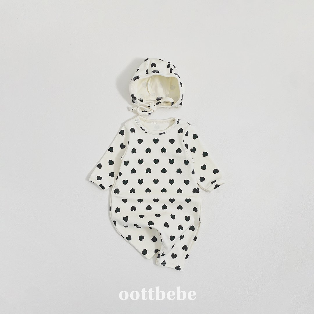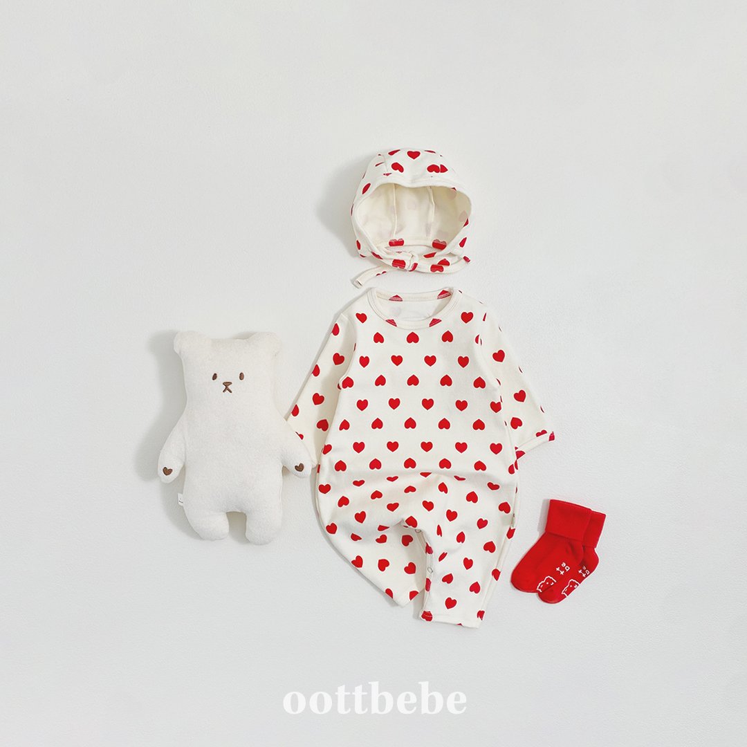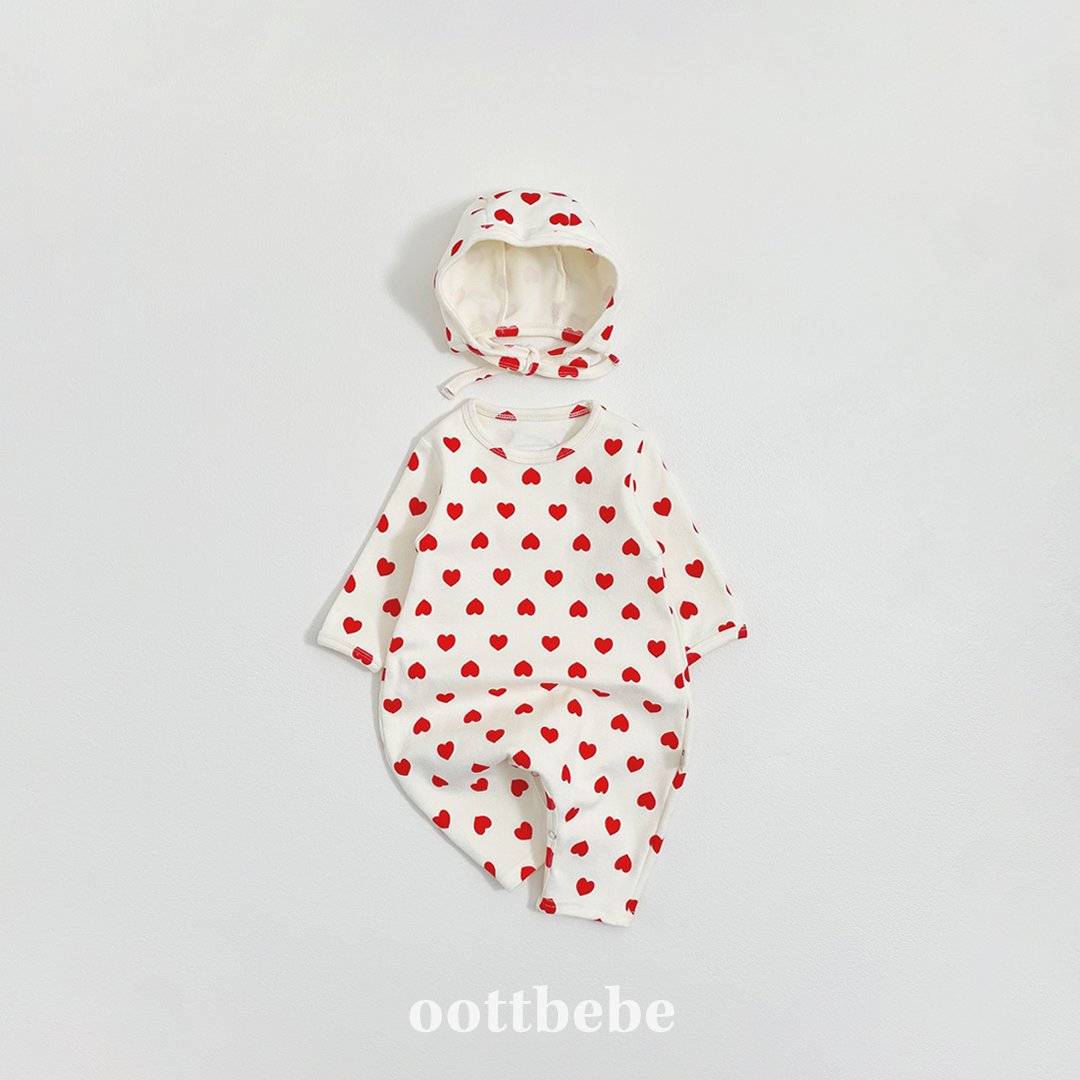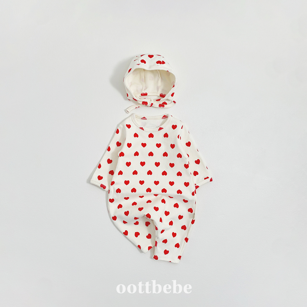 ❄️預訂 韓國直送❄️🇰🇷OOTTBEBE兩色愛心滿印長袖連身服帽子兩件套裝