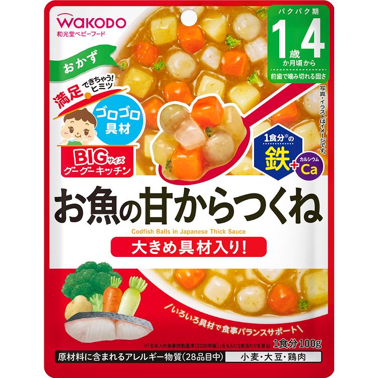 🇯🇵預訂 日本直送🇯🇵和光堂Wakodo日式醬汁鱈魚丸100g(16m+) 🚚預計貨期:約14-21個工作天到貨 (貨期有機會提早或延遲) 鮮嫩的白魚丸和大量蔬菜,拌上甜辣的日式醬汁。 成分: 蔬菜(胡蘿蔔(國產)、白蘿蔔、西蘭花)、土豆、白魚丸(魚糜(鱈魚醬)、洋蔥、澱粉、麵包屑(含小麥)、大豆蛋白粉、植物油、鹽)、糖、醬油、雞肉提取物、鰹魚和海帶湯、番茄醬、鹽/增稠劑(改性澱粉)、碳酸鈣、檸檬酸、焦磷酸鐵 營養成分: 每100克包裝:能量:53千卡,蛋白質:1.9克,脂肪:0.38克,碳水化合物:8-13克,鹽當量:0.59克,鈣:50毫克,鐵:1.5-2.4毫克 食用方法: 由於食品包中的食物已經過調理,所以可以直接食用。如若要加熱的情況,可跟從以下方法: 如使用熱水加熱,請把食品包在未開封的狀態下浸泡在熱水中1-2分鐘。如使用微波爐,請把食品包內的食物倒進相應的器皿中,加熱30秒(500W)。 注意事項及禁忌 •請不要把食品包放在用火加熱中的熱水中。 •由於加熱後的食品包會變得滾燙,所以請小心避免燙傷。 •請在確認食物的溫度後才讓孩子食用。 •請不要食剩後再留待下次食用。 •食品包上的月齡只供參考,請根據孩子的成長而決定是否適合食用。 •請不要食剩後再留待下次食用。 *包裝設計等如有更改,恕不另行通知。