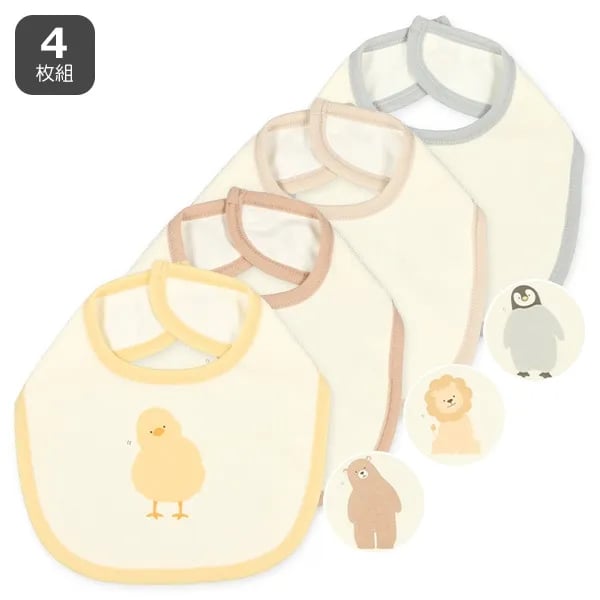 🇯🇵預訂 日本直送🇯🇵動物歪頭印花口水巾圍兜四件套 🚚預計貨期:約14~21個工作天到貨 (貨期有機會提早或延遲) 包括:四條口水巾 📐尺寸:長度14.5cm 頸圍29cm -易於穿戴且不易脫落的一鍵式按鈕類型♪ 正面和邊緣:100% 棉 背面:100% 聚酯纖維 📦貨品跟付款先後次序訂貨及發貨💕