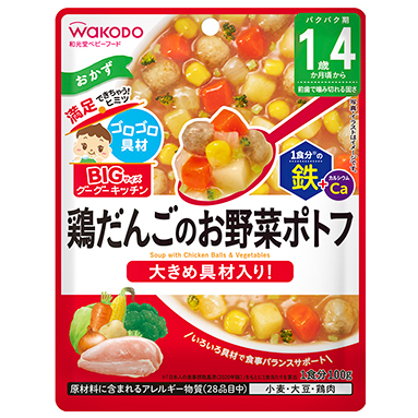 🇯🇵預訂 日本直送🇯🇵和光堂Wakodo蔬菜燉雞肉丸100g(16m+) 🚚預計貨期:約14-21個工作天到貨 (貨期有機會提早或延遲) 它的味道清淡,融合了嫩滑雞肉丸和大量蔬菜的香味。 成分: 蔬菜(胡蘿蔔(國產)、洋蔥、玉米、高麗菜、綠花椰菜)、雞肉丸(雞肉、麵包屑(含小麥)、洋蔥、顆粒狀大豆蛋白、鹽)、馬鈴薯、炒洋蔥、雞肉萃取、糖、蔬菜濃湯膏、鹽、米醋/增稠劑(改質澱粉)、碳酸鈣、檸檬酸、焦磷酸鐵 營養成分: 每100克包裝:能量:50千卡,蛋白質:2.4克,脂肪:0.43克,碳水化合物:9.2克,鹽當量:0.47克,鈣:50毫克,鐵:1.5-2.4毫克 食用方法: 由於食品包中的食物已經過調理,所以可以直接食用。如若要加熱的情況,可跟從以下方法: 如使用熱水加熱,請把食品包在未開封的狀態下浸泡在熱水中1-2分鐘。如使用微波爐,請把食品包內的食物倒進相應的器皿中,加熱30秒(500W)。 注意事項及禁忌 •請不要把食品包放在用火加熱中的熱水中。 •由於加熱後的食品包會變得滾燙,所以請小心避免燙傷。 •請在確認食物的溫度後才讓孩子食用。 •請不要食剩後再留待下次食用。 •食品包上的月齡只供參考,請根據孩子的成長而決定是否適合食用。 •請不要食剩後再留待下次食用。 *包裝設計等如有更改,恕不另行通知。
