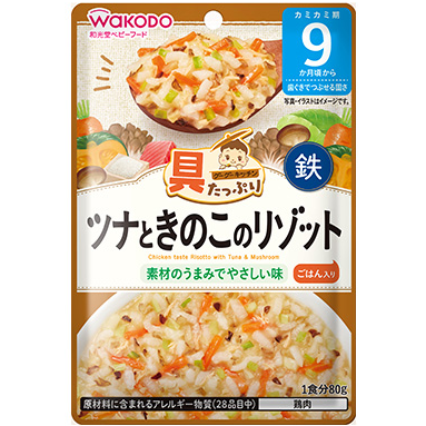 🇯🇵預訂 日本直送🇯🇵和光堂Wakodo鮪魚蘑菇燴飯80g(9m+) 🚚預計貨期:約14-21個工作天到貨 (貨期有機會提早或延遲) 這道燴飯是用易剝碎的金槍魚和兩種蘑菇與米飯一起在雞湯中慢燉而成的。 成分: 蔬菜(胡蘿蔔、高麗菜)、精米(國產)、煮熟的舞茸菇、煮熟的鮪魚、南瓜泥、雞湯塊、雞肉萃取物、植物油、煮熟的香菇、鹽/增稠劑(改性澱粉)、焦磷酸鐵 營養成分: 每80克包裝:能量:46千卡,蛋白質:1.4克,脂肪:0.55克,碳水化合物:8.8克,鈉:0.31克,鐵:1.5毫克 食用方法: 由於食品包中的食物已經過調理,所以可以直接食用。如若要加熱的情況,可跟從以下方法: 如使用熱水加熱,請把食品包在未開封的狀態下浸泡在熱水中1-2分鐘。如使用微波爐,請把食品包內的食物倒進相應的器皿中,加熱30秒(500W)。 注意事項及禁忌 •請不要把食品包放在用火加熱中的熱水中。 •由於加熱後的食品包會變得滾燙,所以請小心避免燙傷。 •請在確認食物的溫度後才讓孩子食用。 •請不要食剩後再留待下次食用。 •食品包上的月齡只供參考,請根據孩子的成長而決定是否適合食用。 •請不要食剩後再留待下次食用。 *包裝設計等如有更改,恕不另行通知。