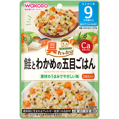 🇯🇵預訂 日本直送🇯🇵和光堂Wakodo鮭魚海帶五目飯80g(9m+) 🚚預計貨期:約14-21個工作天到貨 (貨期有機會提早或延遲) 將鮭魚和裙帶菜切成一口大小的塊,在鰹魚和海帶湯中煮至蓬鬆。 成分: 蔬菜(胡蘿蔔、高麗菜)、精米(國產)、馬鈴薯、鰹魚海帶高湯、鮭魚絲、醬油(含小麥和大豆)、煮熟的香菇、雞肉提取物、白砂糖、食用鹽、乾裙帶菜/增稠劑(改性澱粉)、碳酸鈣、檸檬酸 營養成分: 每80克包裝:能量45千卡,蛋白質1.2克,脂肪0.19克,碳水化合物9.5克,鹽當量0.31克,鈣100毫克 食用方法: 由於食品包中的食物已經過調理,所以可以直接食用。如若要加熱的情況,可跟從以下方法: 如使用熱水加熱,請把食品包在未開封的狀態下浸泡在熱水中1-2分鐘。如使用微波爐,請把食品包內的食物倒進相應的器皿中,加熱30秒(500W)。 注意事項及禁忌 •請不要把食品包放在用火加熱中的熱水中。 •由於加熱後的食品包會變得滾燙,所以請小心避免燙傷。 •請在確認食物的溫度後才讓孩子食用。 •請不要食剩後再留待下次食用。 •食品包上的月齡只供參考,請根據孩子的成長而決定是否適合食用。 •請不要食剩後再留待下次食用。 *包裝設計等如有更改,恕不另行通知。