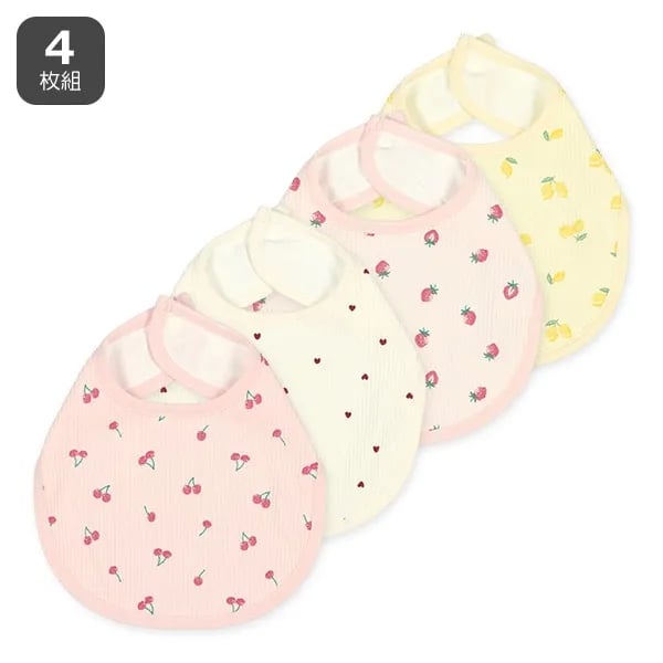 🇯🇵預訂 日本直送🇯🇵愛心水果印花華夫格口水巾圍兜四件套 🚚預計貨期:約14~21個工作天到貨 (貨期有機會提早或延遲) 包括:四條口水巾 📐尺寸:長度14.5cm 頸圍29cm -易於穿戴且不易脫落的一鍵式按鈕類型♪ 外層:60% 棉,40% 聚酯纖維 內層:100% 聚酯纖維 📦貨品跟付款先後次序訂貨及發貨💕
