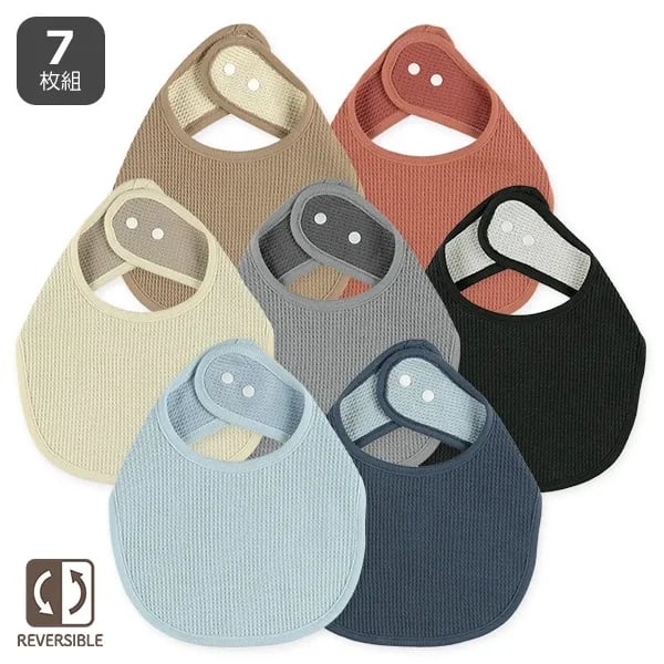🇯🇵預訂 日本直送🇯🇵純色雙面華夫格口水巾圍兜七件套 🚚預計貨期:約14~21個工作天到貨 (貨期有機會提早或延遲) 包括:七條口水巾 📐尺寸:長度13.5cm 頸圍29~31cm -華夫格面料 -雙面可用 -易於穿戴且不易脫落的一鍵式按鈕類型♪ 布料:60% 棉,40% 聚酯纖維 包邊:100% 棉 📦貨品跟付款先後次序訂貨及發貨💕