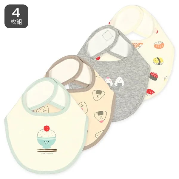 🇯🇵預訂 日本直送🇯🇵飯團壽司滿印口水巾圍兜四件套 🚚預計貨期:約14~21個工作天到貨 (貨期有機會提早或延遲) 包括:四條口水巾 📐尺寸:長度14cm 頸圍29cm -易於穿戴且不易脫落的一鍵式按鈕類型♪ 正面及邊緣:100% 純棉 背面:100% 聚酯纖維 📦貨品跟付款先後次序訂貨及發貨💕