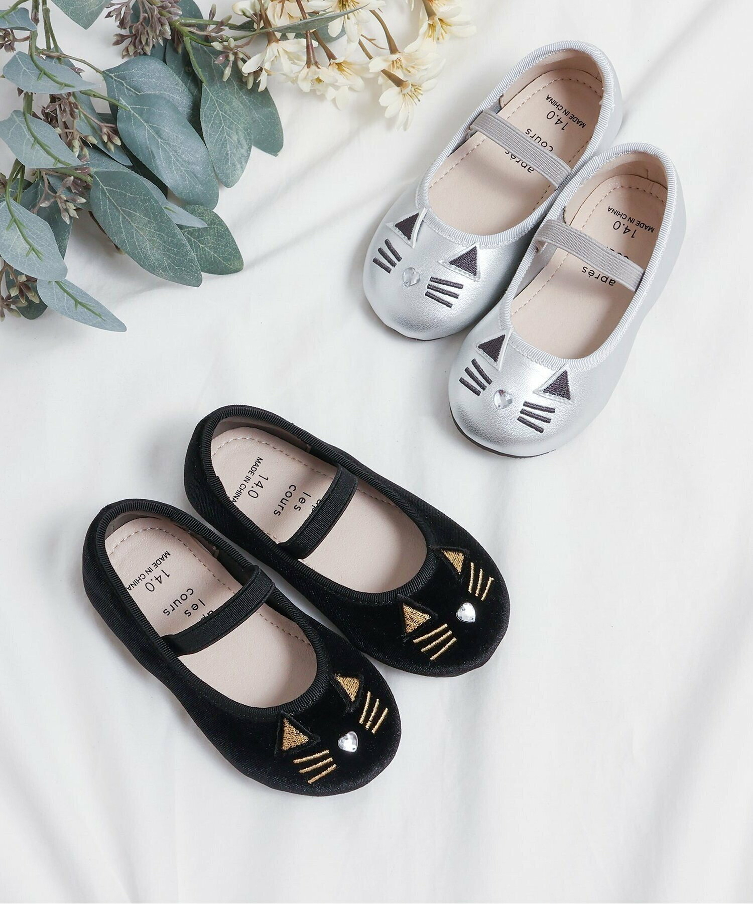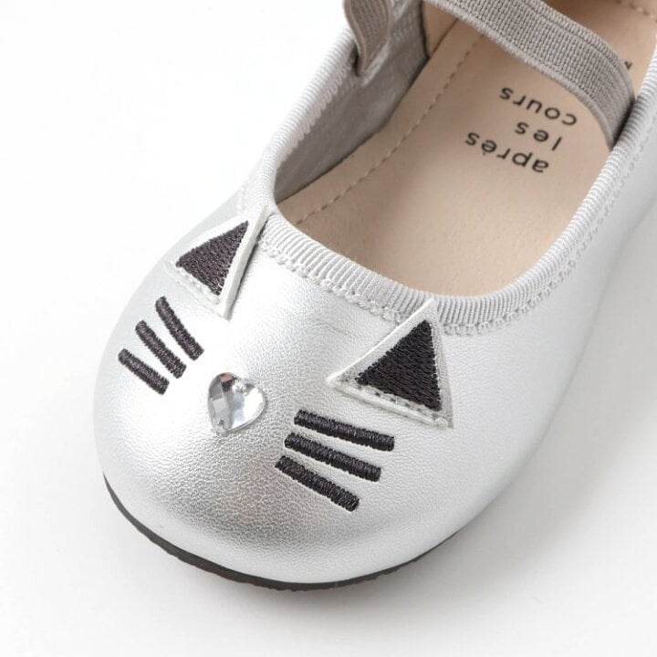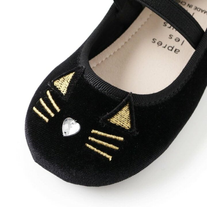 🇯🇵預訂 日本直送🇯🇵Apres les cours兩色貓咪平底鞋 🚚預計貨期:約14~21個工作天到貨 (貨期有機會提早或延遲) 🎨顏色:黑色|銀色 📐鞋碼:14|15|16|17|18cm 黑色 鞋面:天鵝絨 鞋底:合成皮革 銀色 鞋面:合成皮革 鞋底:合成皮革 📦貨品跟付款先後次序訂貨及發貨💕