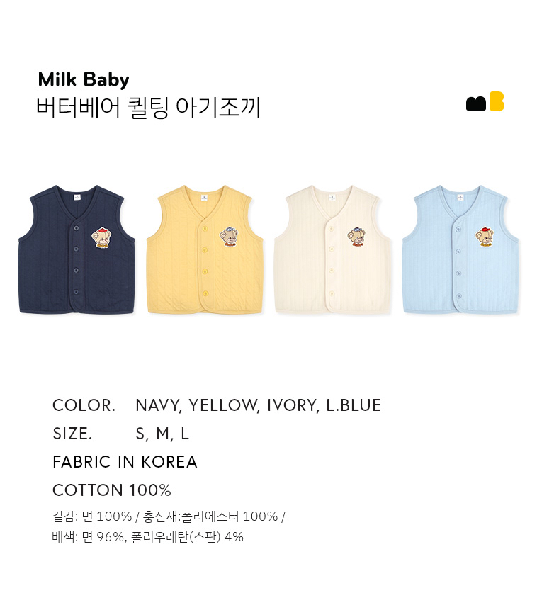 🍂預訂 韓國直送🍂🇰🇷Milk Baby四色小熊刺繡貼花絎縫超寬鬆背心外套 🚚預計貨期:約14-21個工作日 (貨期有機會提早或延遲) 🎨顏色:海軍藍|黃色|象牙|淺藍 📐尺碼:S|M|L 外層布料:100%棉 填充物:100%聚酯纖維 顏色組合:96% 棉,4% 聚氨酯 韓國布料 越南代工 風格資料 合身 :超寬鬆 彈性 :不存在 厚度 :厚 襯墊 :不存在 穿著季節 :春夏、秋冬 📦熱門貨品將跟據客人付款先後次序分配💞 🔺如產品出現斷貨將會全數退回🔺 ⚠️除非有列明 否則不包含其他服飾及配飾