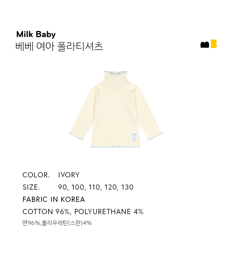 🍂預訂 韓國直送🍂🇰🇷Milk Baby小熊標籤線色羅紋長袖高領上衣 🚚預計貨期:約14-21個工作日 (貨期有機會提早或延遲) 🎨顏色:象牙 📐尺碼:90|100|110|120|130 棉 96%,聚氨酯 4% 韓國布料 越南代工 風格資料 合身 :寬鬆 彈性 :出色 厚度 :薄 襯墊 :不存在 穿著季節 :春秋 📦熱門貨品將跟據客人付款先後次序分配💞 🔺如產品出現斷貨將會全數退回🔺 ⚠️除非有列明 否則不包含其他服飾及配飾